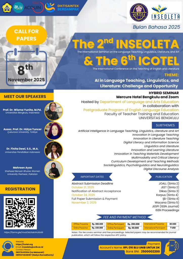 For the 6th ICOTEL, the theme is AI in Language Teaching, Linguistics, and Literature: Challenge and Opportunity. This year’s conference will explore the transformative impact of technology on modern language teaching and literature, highlighting innovative approaches that address the needs of learners in an increasingly digital world.
